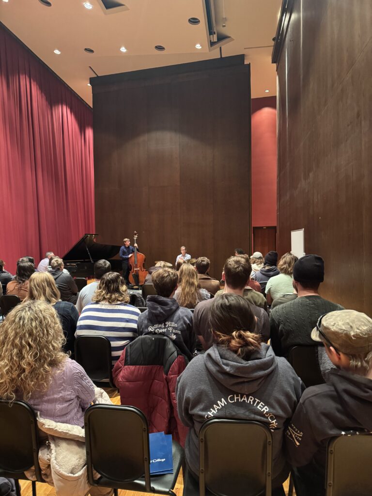 Joined by several members of the LVC Jazz Faculty, Riley performed two jazz standards: “Night and Day” by Cole Porter and “Footprints” by Wayne Shorter. Riley used these pieces to illustrate the conversational nature of good jazz music, as experienced players treat their instruments as extensions of themselves, and are able to focus their mental energy on listening to what their fellow musicians are saying with their musical choices.